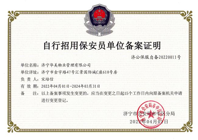 自行招用保安員單位備案證明