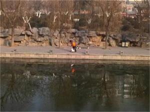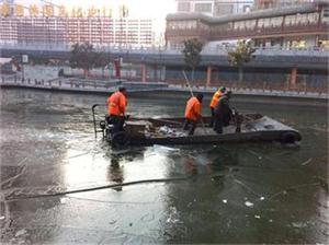 三九寒天,堅持在河道一線的環衛保潔人員,打撈船在水面正破冰作業,二灘人工沖刷,用辛勤的付出換來河道的美麗環境。